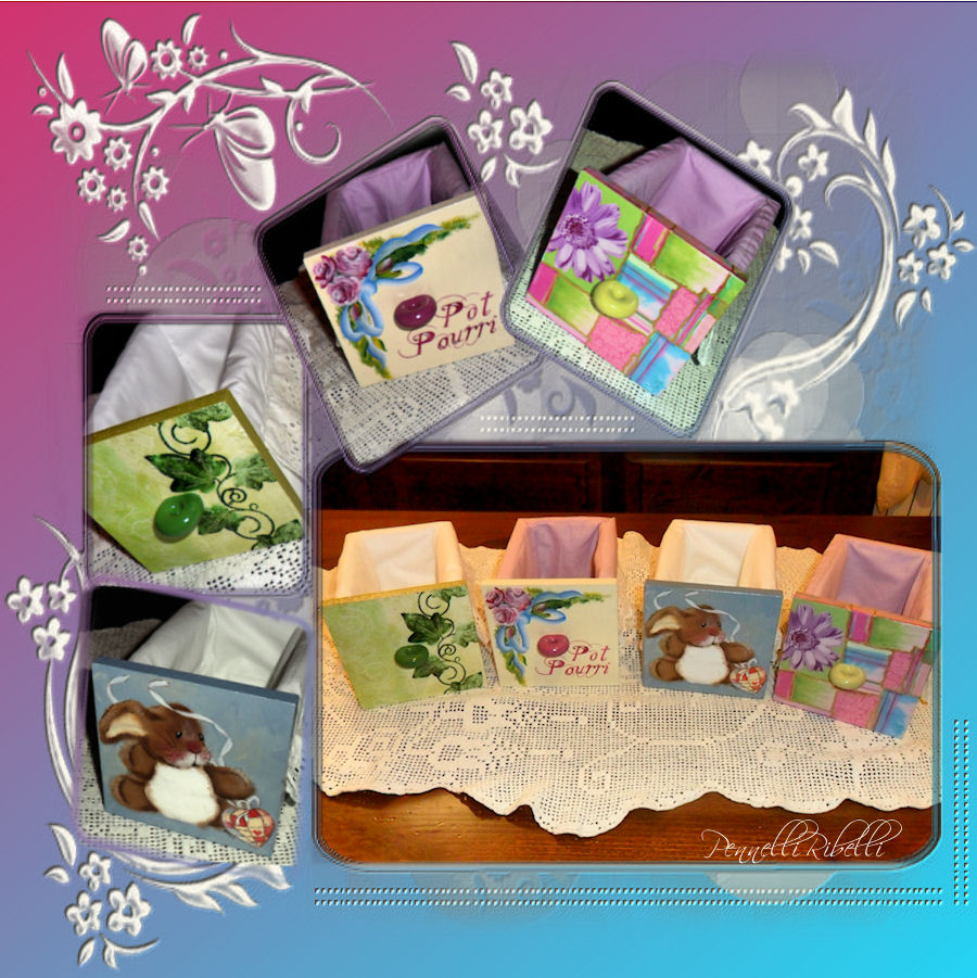 Qui c’è stata una vera sfida nella sfida. Prima di tutto volevo cambiare proprio la destinazione d’uso di questi cassetti, ovvero farli diventare qualcosa di diverso da dei semplici cassetti da cassettiera. Quindi ho deciso che sarebbero diventati dei piccoli contenitori per salviette per ospiti, pot-pourri, batuffoli di ovatta o altro, da tenere sul mobile del bagno.