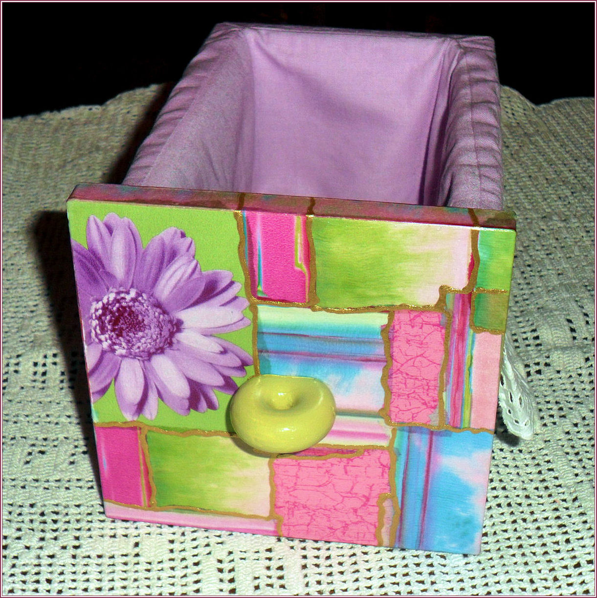 Questo cassetto è realizzato conn la tecnica del Décopatch, ovvero pezzetti strappati a mano di un tipo di carta creato per questo uso, incollati con una colla apposita e rifiniti fra pezzetto e pezzetto con una pasta finto piombo oro (la stessa, in tubetto, che si usa per i colori da vetro).