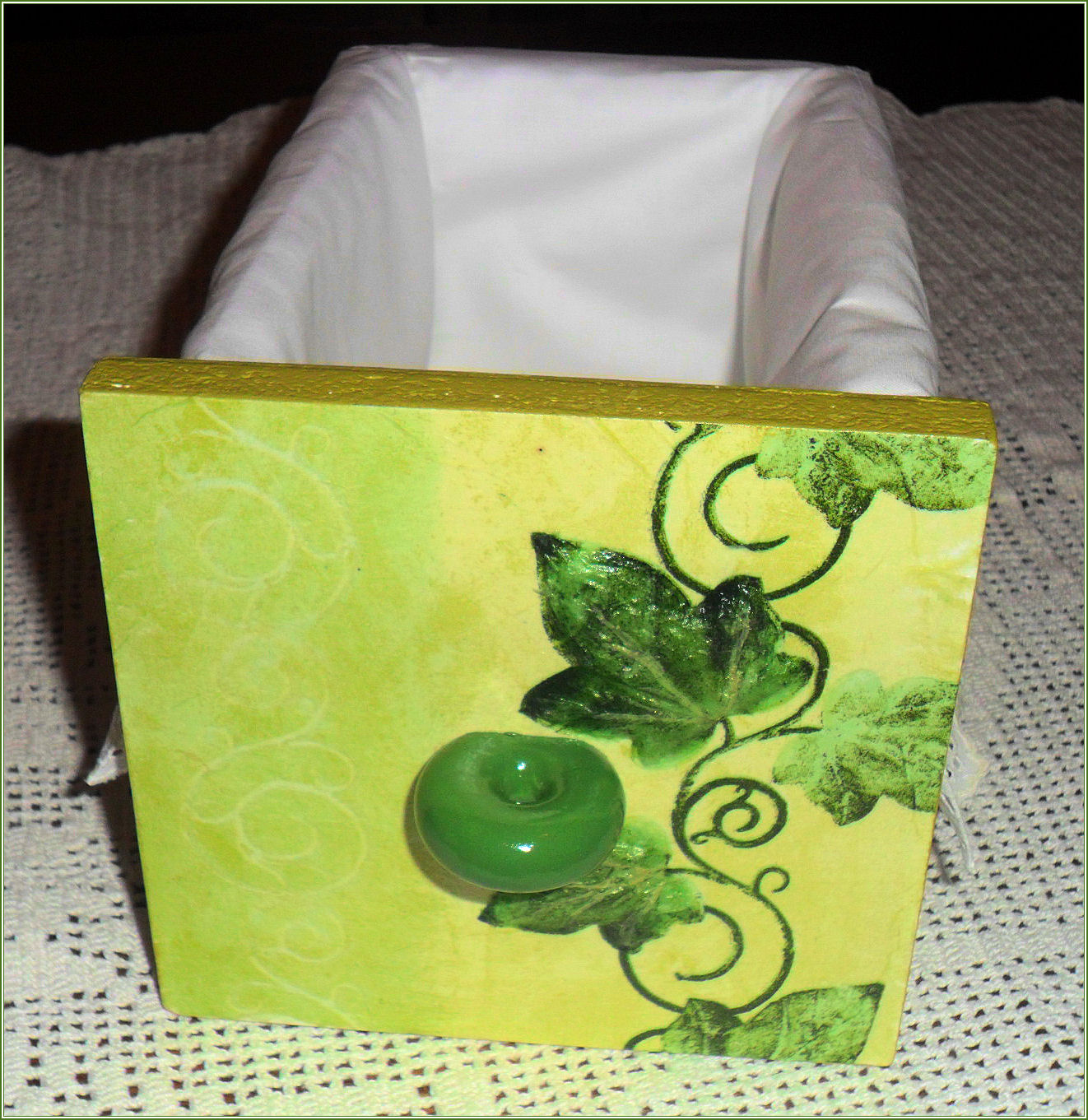 Questo cassetto è realizzato con la tecnica del découpage con tovagliolo e con particolari in 3D (le due foglie di edera) riempiti con silicone.