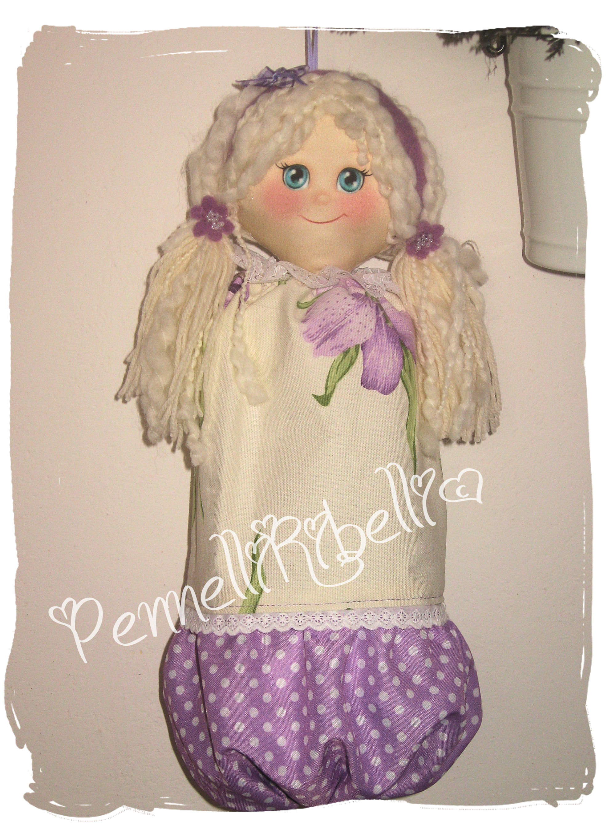 Ma per festeggiare la cucina provenzale ho deciso di farmi un portasacchetti. Quello di prima, in plastica, era ormai rotto e quindi mi sono decisa. C’è voluto un po’, visto che il cucito non è il mio forte, ma alla fine il risultato è dignitoso. Ho usato una di quelle simpaticissime faccine che avevo comprato già pronte, l’ho imbottita e l’ho montata su un “vestitino” che le avevo cucito. Eccola qua: