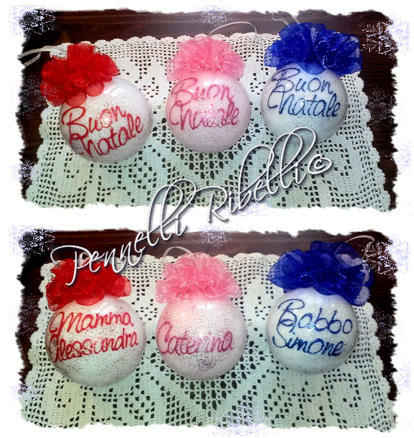 Mentre ero al mercatino di San Martino una signora mi fece richiesta di una pallina personalizzata per il 1^ Natale della sua nipotina. Da lì in poi è stato tutto un susseguirsi di richieste per queste palline, chi le ha viste ne ha subito ordinata una per regalare. E anche a me è venuta voglia di farne tre per mio cugino, la moglie e la piccola Caterina, che sono venuti a trovarmi proprio ieri. Eccole qui, assoluta novità di quest’anno. Fronte/Retro, ovviamente.