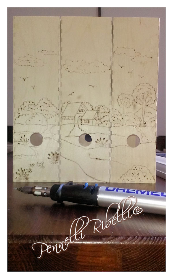 Ho ricalcato con la carta grafite un disegno che rappresenta un paesaggio di campagna, suddiviso su tre dei contenitori e poi ho acceso il Versatip ed ho ripassato i contorni del disegno, che sono stati così “stampati a fuoco” nel legno.