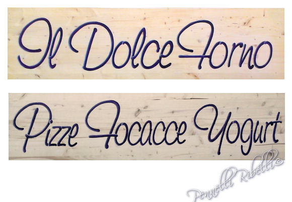 Il forno del paese vicino ha aperto un nuovo punto vendita, inaugurato proprio ieri sera con grade affluenza di gente, e mi erano state commissionate due insegne in legno per l’interno del negozio. Che responsabilità, tutto il paese le vedrà ogni giorno. Inutile dire che ho fatto del mio meglio, e spero che il risultato sia gradito ai più (sennò sai che figura!)