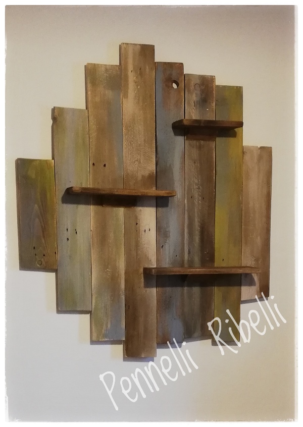 Ho tagliato tre pezzi di asse in lunghezze differenti e le ho incollate ognuna sopra ad uno dei triangoli. Ho anche avvitato il tutto per maggior sostegno e ho dato una mano di mordente colore noce medio. Ho messo due ganci sul retro e…ta-dah!