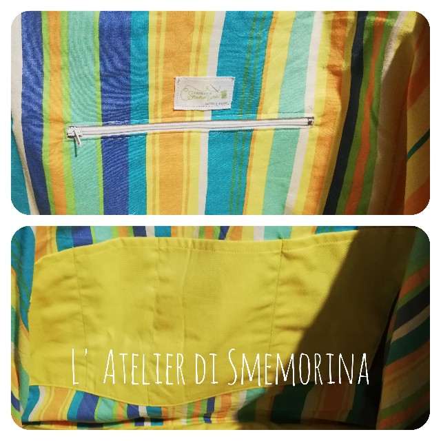 Una volta fatta la borsa, ho recuperato una vecchia federa colorata, e l’ho tagliata a misura. Poi ho realizzato una tasca interna con cerniera e una tasca colorata applicata sopra, separata in settori di varia misura.