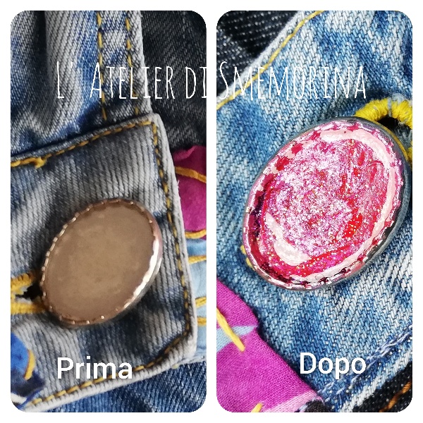 E siccome il bottone in metallo era vuoto, nonostante fosse già piacevole ho voluto comunque personalizzarlo e l’ho riempito con un colore glitterato 3D a cui più ho passato sia una mano di smalto per unghie, vetrificando il tutto.