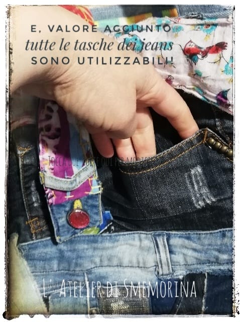 Ho scelto e strappato tutti i prezzi necessari dai vari jeans, ho preparato la sagoma della borsa su una stoffa leggera e una volta scelta la composizione definitiva li ho cuciti sulla stoffa di base uno alla volta, soprammettendoli come da progetto (la foto del post precedente).