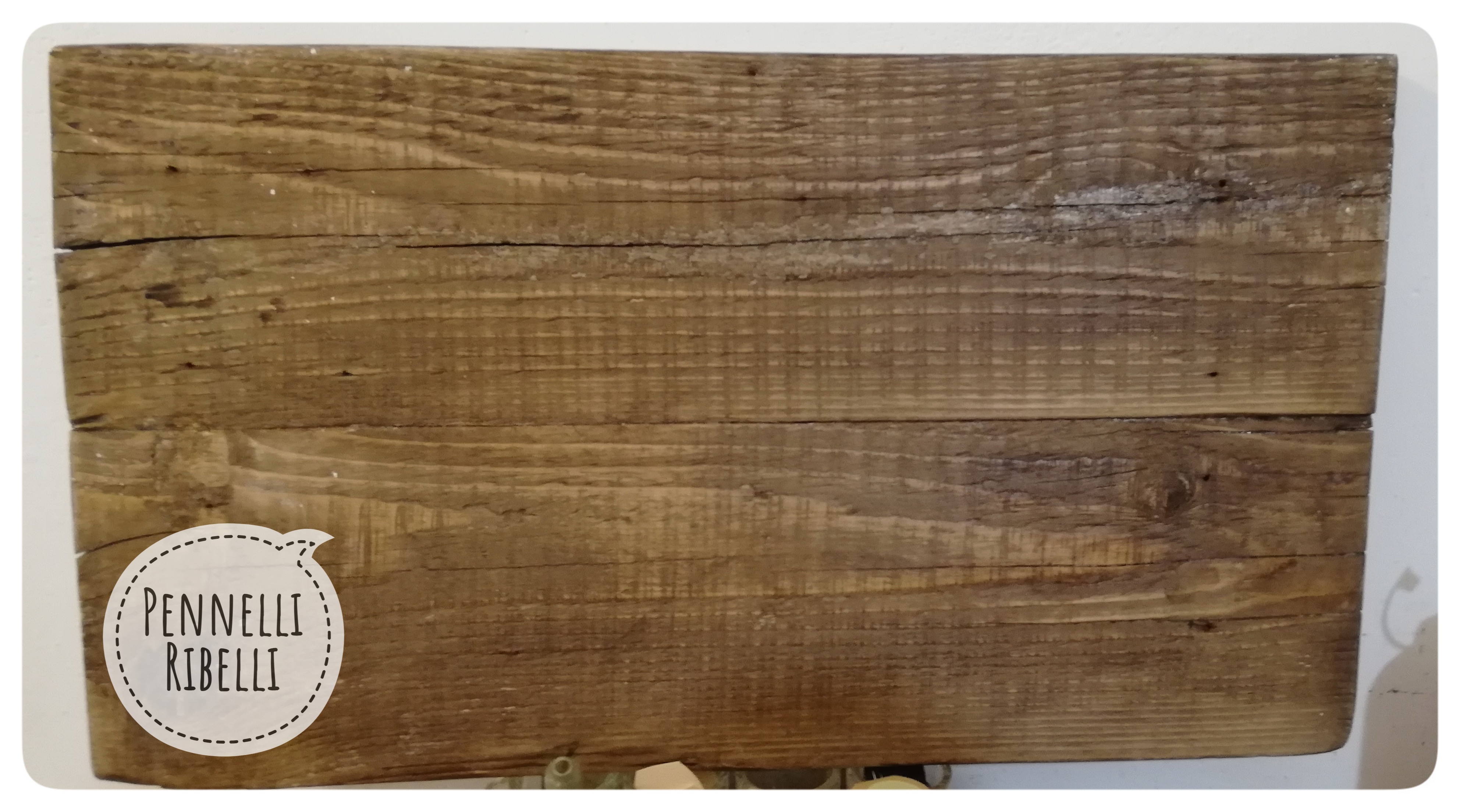 Ho preso un vecchio pannello composto da due assi di legno attaccate insieme e l’ho scartato tutto per eliminare schegge e altre parti sporgenti. L’ho passato con due mani di impregnante color noce