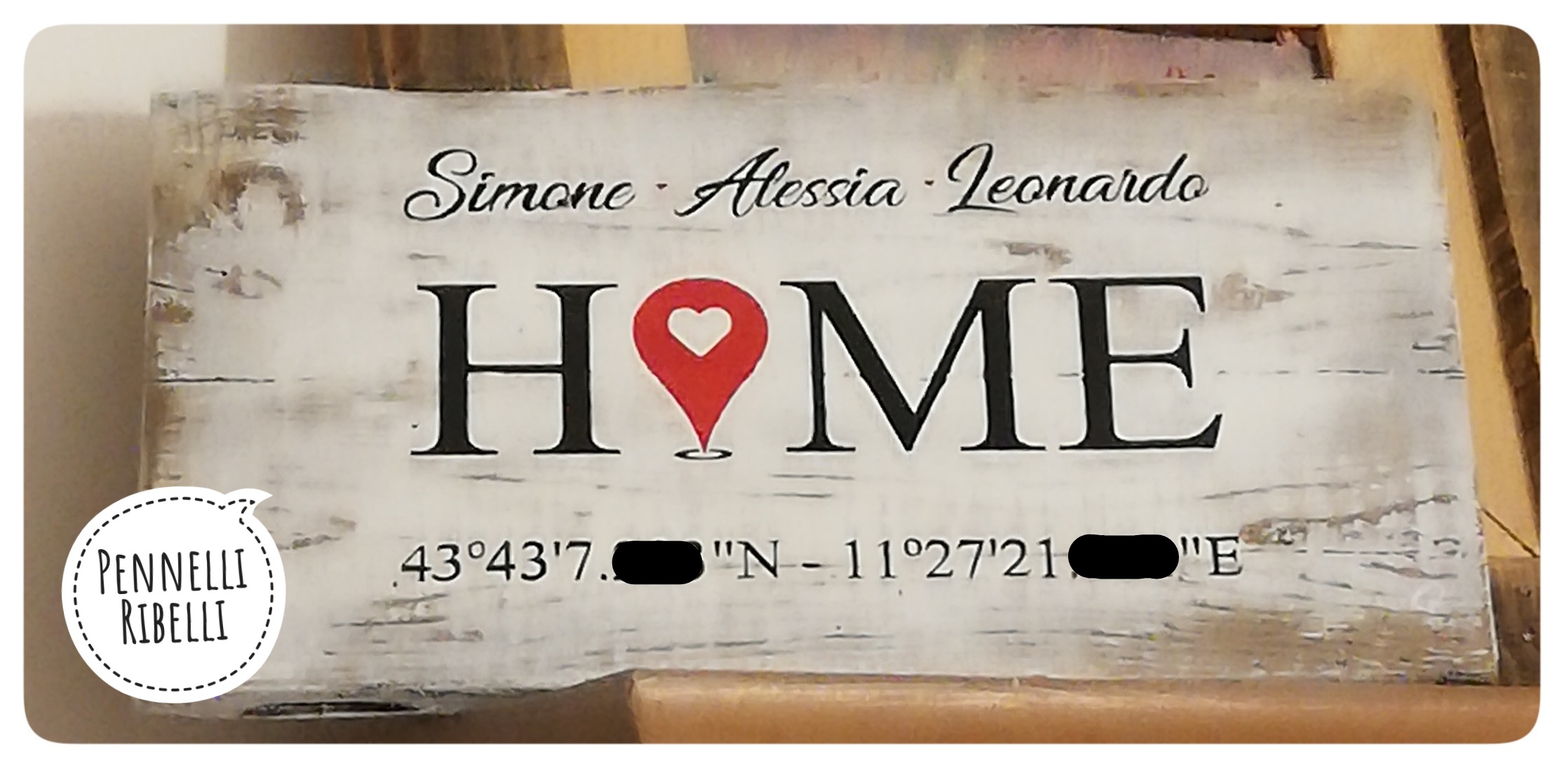 Ho preparato con il plotter uno stencil con il vinile adesivo e l’ho applicato sulle assi. Poi ho dipinto, rifinendo meglio una volta tolto l’adesivo. La mia personalizzazione è stata quella di cambiare la ”O” di HOME con il puntatore di Maps al quale ho sostituito il cerchietto centrale con un cuoricino. Per la privacy nelle foto ho oscurato parzialmente alcuni numeri della posizione.