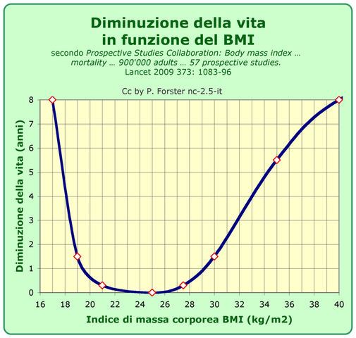 Come si capisce il BMI ottimale è compreso fra 23 e 27.