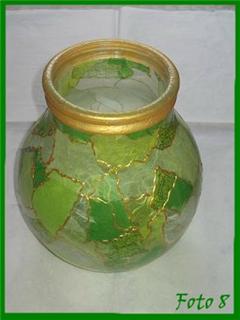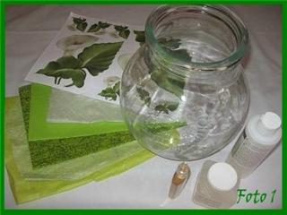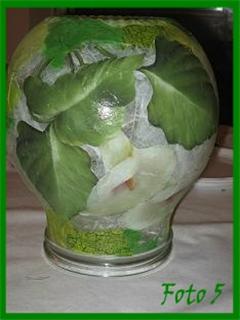1 damigiana da 5 litri (o della misura che preferisci), carta di riso bianca, carta di riso in varie tonalità di verde, carta da decopatch tonalità verde, carta da découpage con disegno di una calla, colla per tovagliolo, colore acrilico oro, finto piombo oro, vernice vetrificante all’acqua. (foto 1)